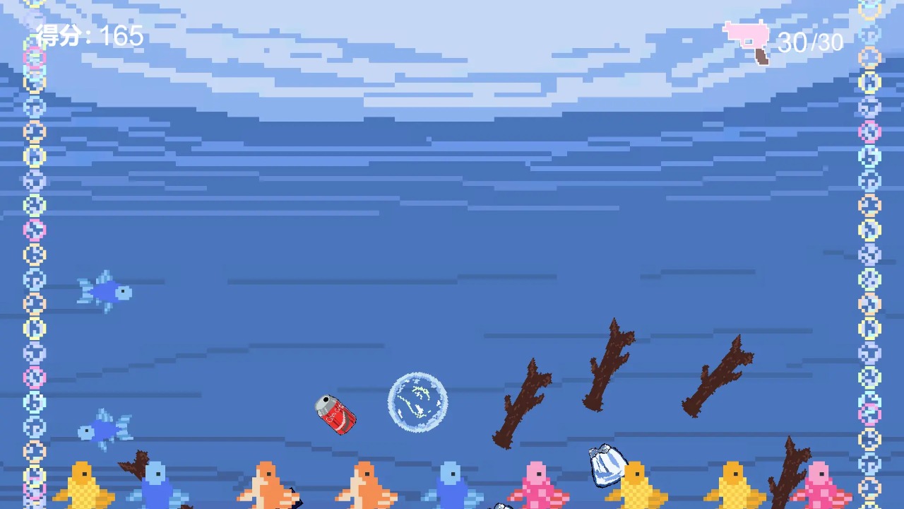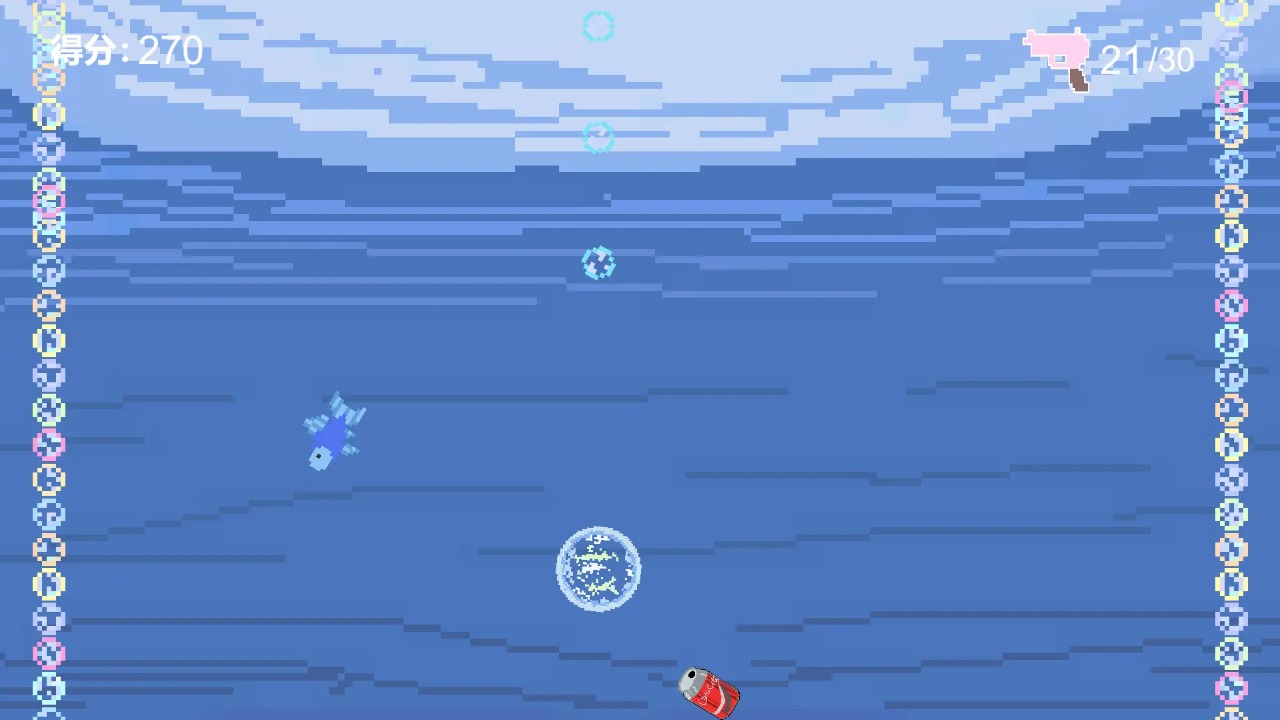 。 此外,面对身后不断追逐的小鱼群,玩家可以通过点击或滑动屏幕控制泡泡的移动方向与发射小泡泡的动作